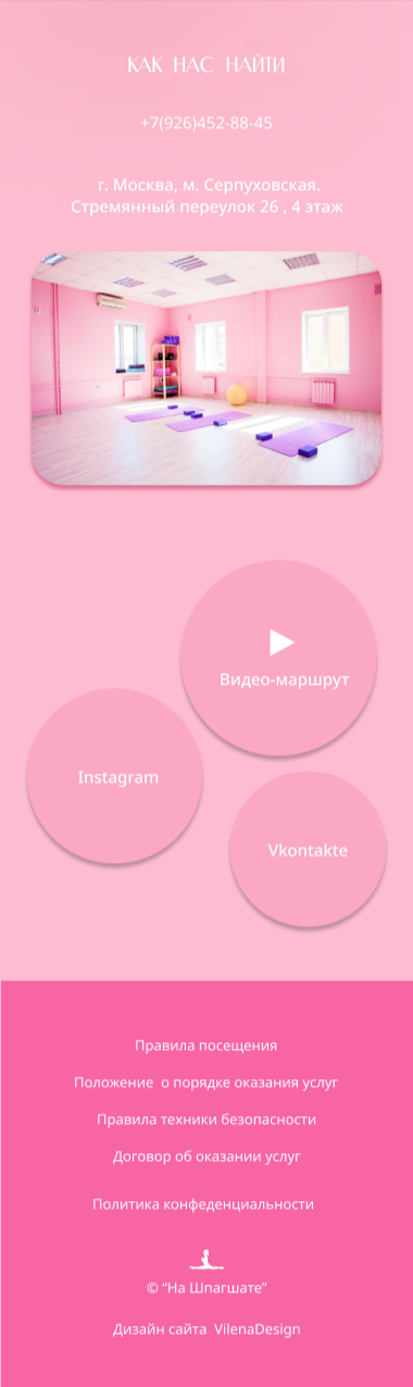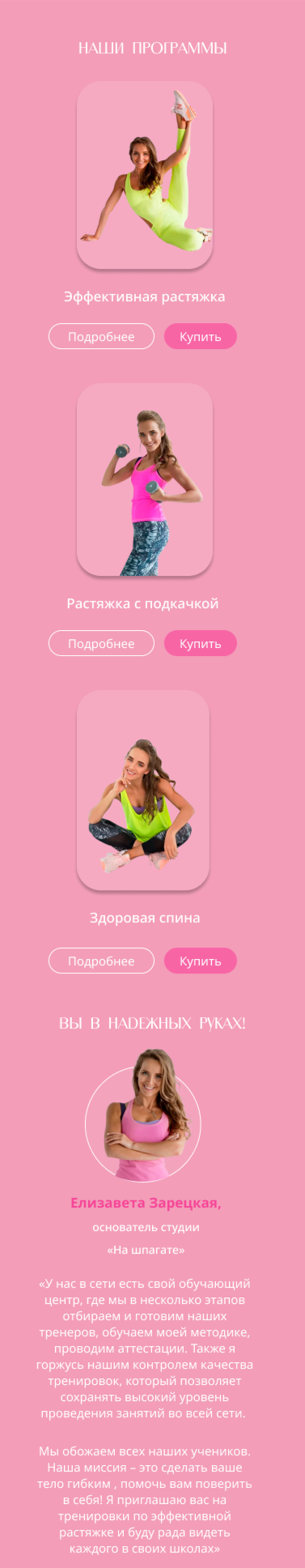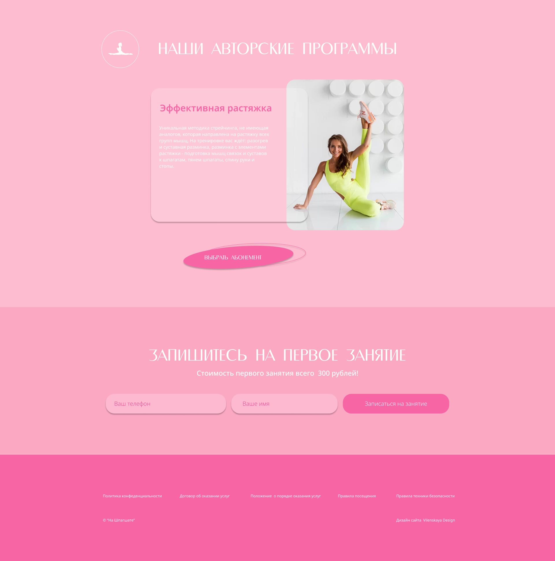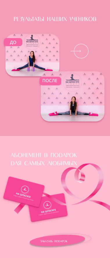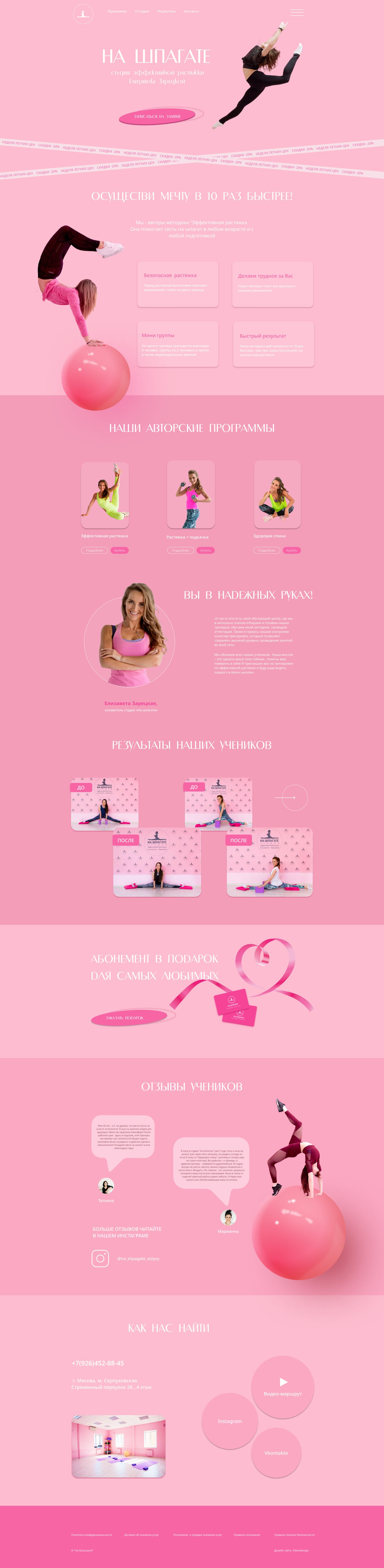 Сделать редизайн сайта студии растяжки "На шпагате". Актуальный сайт уже сверстан на Tilda, но крайне неудачно, с большим количеством ошибок. Дизайн сайта устарел. Нужно было сделать более современный дизайн, упростить и переработать структуру, избавиться от ненужных блоков, упростить громоздкое меню сайта.