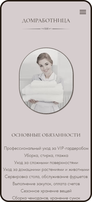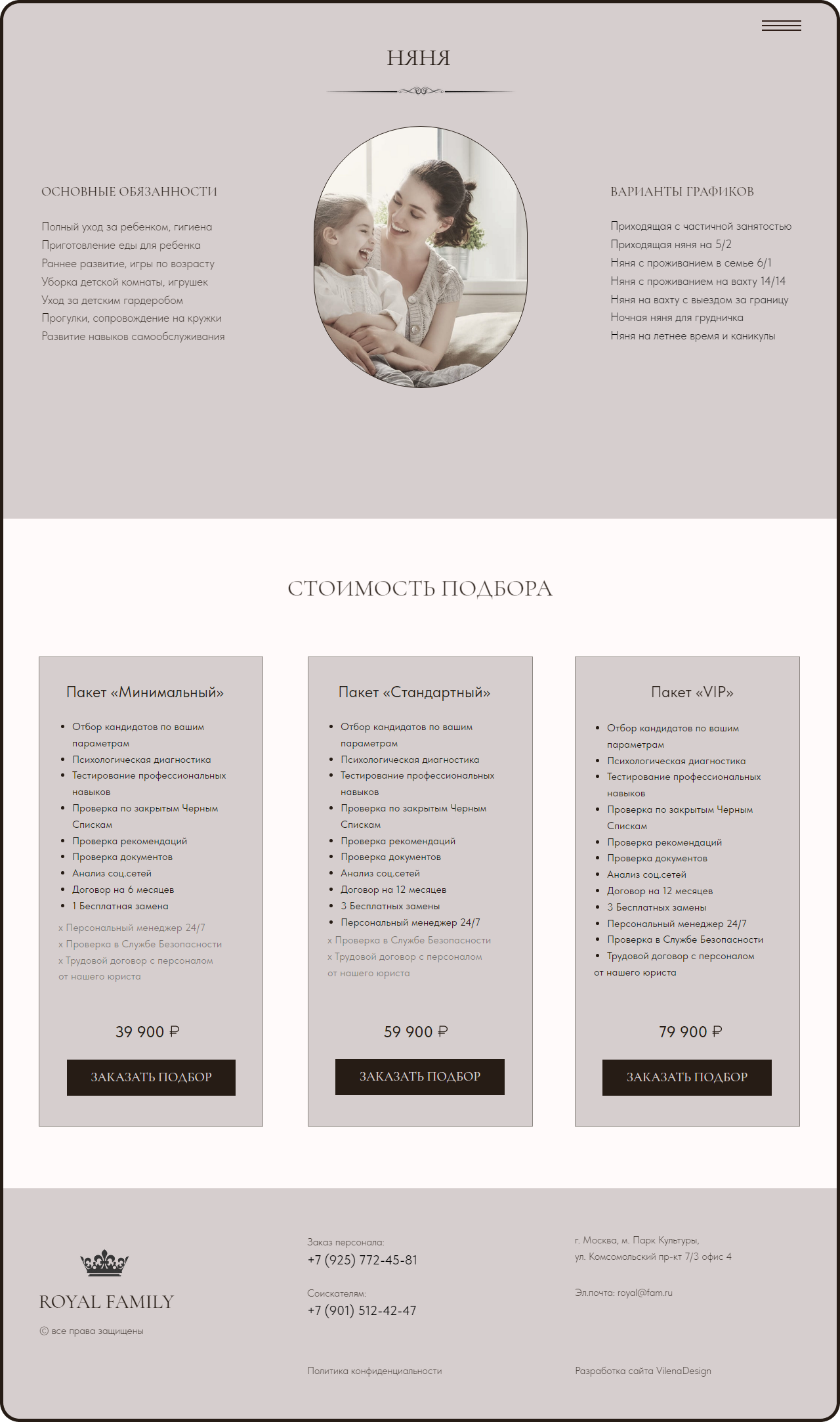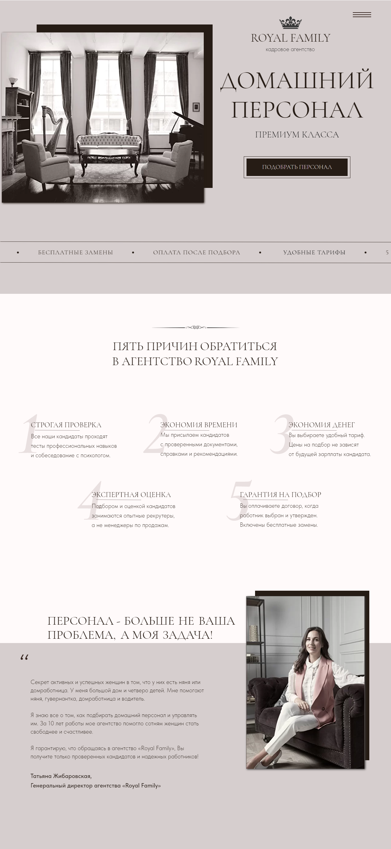 Сделать редизайн сайта агентства по подбору домашнего персонала. По факту - весь сайт я делала с нуля, т.к. владелица решила сделать полный ребрендинг, изменить название и концепцию агентства. В итоге с прошлого сайта пригодились только контакты.